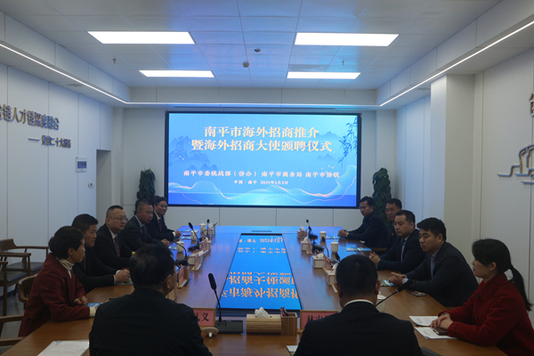 南平市海外招商推介暨海外招商大使颁聘仪式在南平市政府招商服务中心举行 东南网1月4日讯(本网记者 陈艳 文/图 通讯员 谢渊涵) “目前南平各方面包括政策措施人员全部都到位了,我觉得现在的投资环境是最好的,也是最方便最便捷的。”在了解了南平一系列招商引资政策后,法国(马赛)南方华人总商会会长潘春霖倍感信心地说道。 1月3日,为深入贯彻党的二十届三中全会精神和习近平总书记来福建考察重要讲话精神,推进高水平对外开放体制机制改革,认真落实南平市“迎宾客引人流 促消费促发展”工作部署,强化以商招商、产业链招商,加强内外协调联动,由南平市侨联、南平市委统战部(侨办)、南平市商务局协同主办的南平市海外招商推介暨海外招商大使颁聘仪式在南平市政府招商服务中心举行。