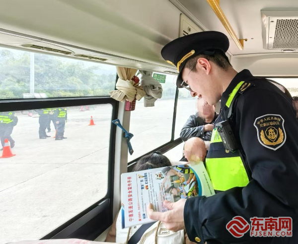 执法员在客车上发放宣传手册