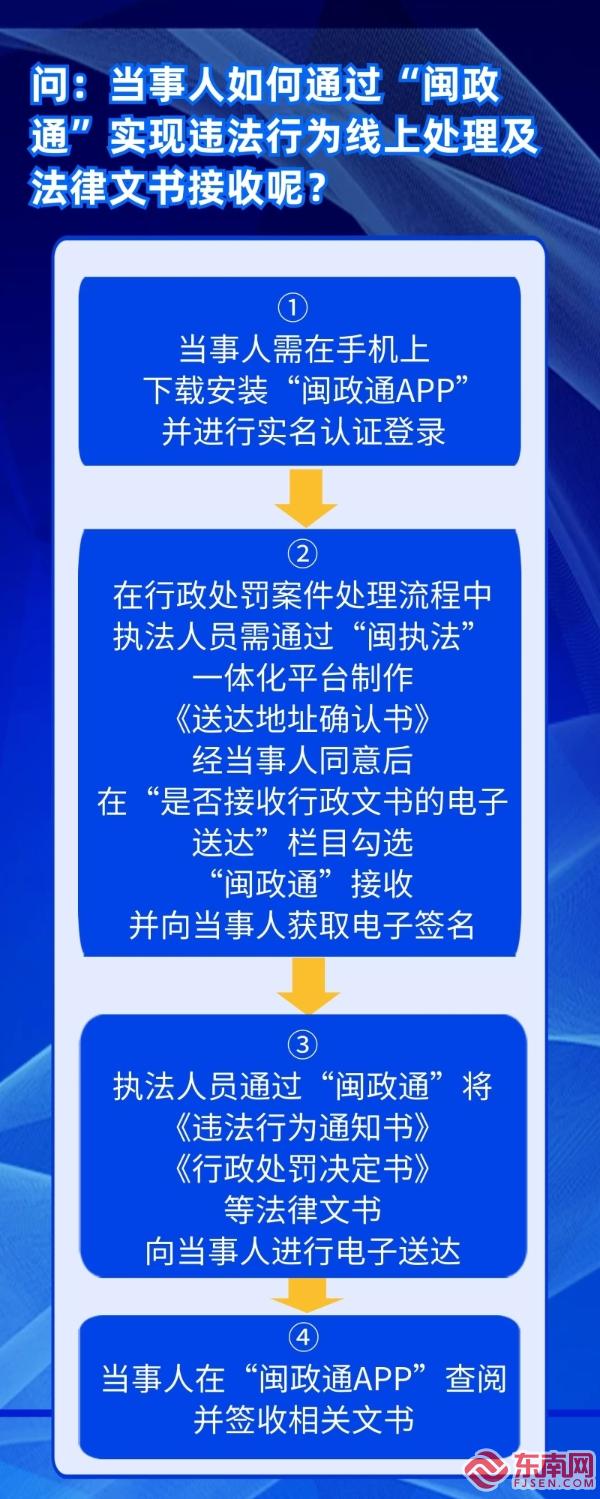 “闽政通”电子送达流程(厦门市交通执法支队供图) 东南网2月27日讯(本网记者 刘玮 通讯员 傅秋萍)日前,记者从厦门交通执法部门获悉,市交通执法支队积极推进“闽政通”电子送达,依托一体化平台“闽政通”实现案件线上处理、文书电子送达、远程签字、线上缴交罚款,完成了厦门交通执法领域首单电子送达。 近期,直属大队调查一件12328投诉件,1月24日当事人前来配合调查。经核查,查明驾驶员杨某存在网络预约出租汽车驾驶员无正当理由未按承诺到达约定地点提供预约服务的违法行为,且是一年内第二次违法,属于严重情节,应当给予行政处罚。 为便利当事人接收相关文书,使群众少跑腿,直属大队积极尝试,探索通过“闽政通”APP进行法律文书电子送达。1月26日,当事人杨某在老家通过其“闽政通”对《违法行为通知书》《行政处罚决定书》等文书进行线上远程电子签收并予以缴款,极大优化群众办事体验感。 当事人如何通过“闽政通”实现违法行为线上处理及法律文书电子送达?相关执法人员介绍,首先,当事人需在手机上下载安装“闽政通APP”,进行实名认证登录。其次,在行政处罚案件处理流程中,执法人员需通过“闽执法”一体化平台制作《送达地址确认书》,经当事人同意后在“是否接收行政文书的电子送达”栏目勾选“闽政通”接收,并向当事人获取电子签名。最后,执法人员制作并审批《违法行为通知书》《行政处罚决定书》后就可以通过“闽政通”实现电子送达,当事人可在“闽政通APP”查阅并签收相关文书。 “通过‘闽政通’进行案件文书电子送达能够实现文书的即时传递,比传统的直接送达、邮寄送达更高效、更便捷,违法当事人可随时随地获取、查阅文书内容。”执法人员说,电子送达记录还可追踪和查询,有效避免纸质文书在传递途中可能出现的损毁、遗失以及信息泄露等问题。 |