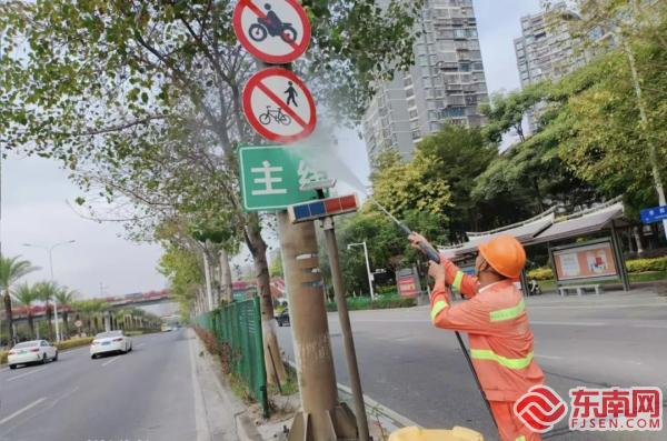 养护工人用高压水枪清洗公路标志牌(厦门公路中心供图)