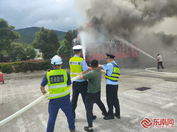 执法员扑灭火情。宁德高速公路行政执法支队供图 执法人员抵达现场时,发现车牌号为皖LG8790的货车正被大火吞噬。若不及时控制火势,将严重威胁服务区内人员和车辆的安全。面对险情,屏南中队高方彬、郑武沉着应对,迅速与消防队员制定救援方案。