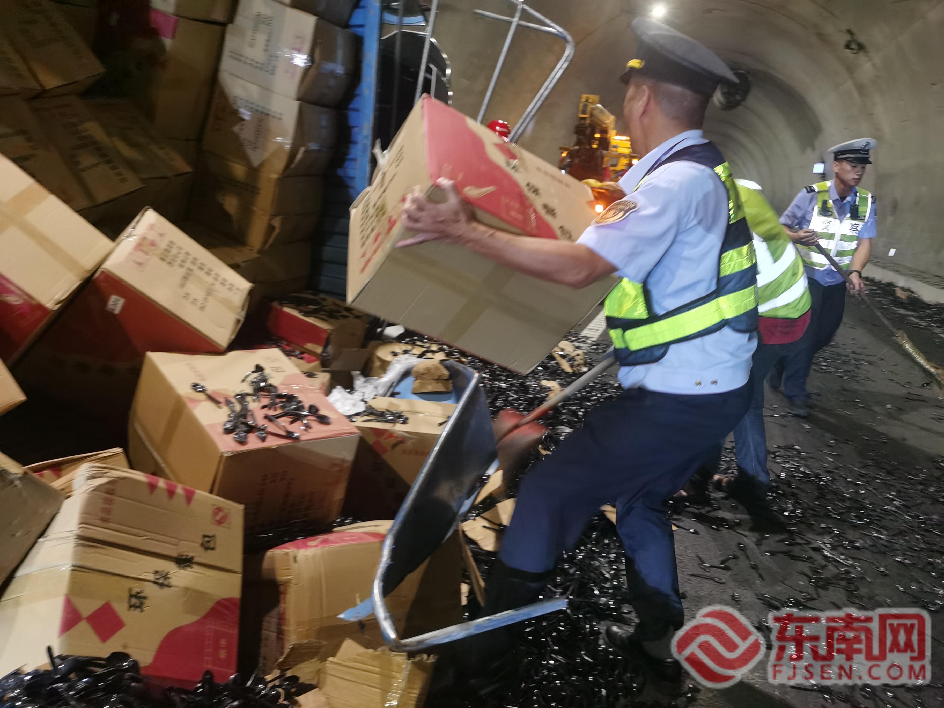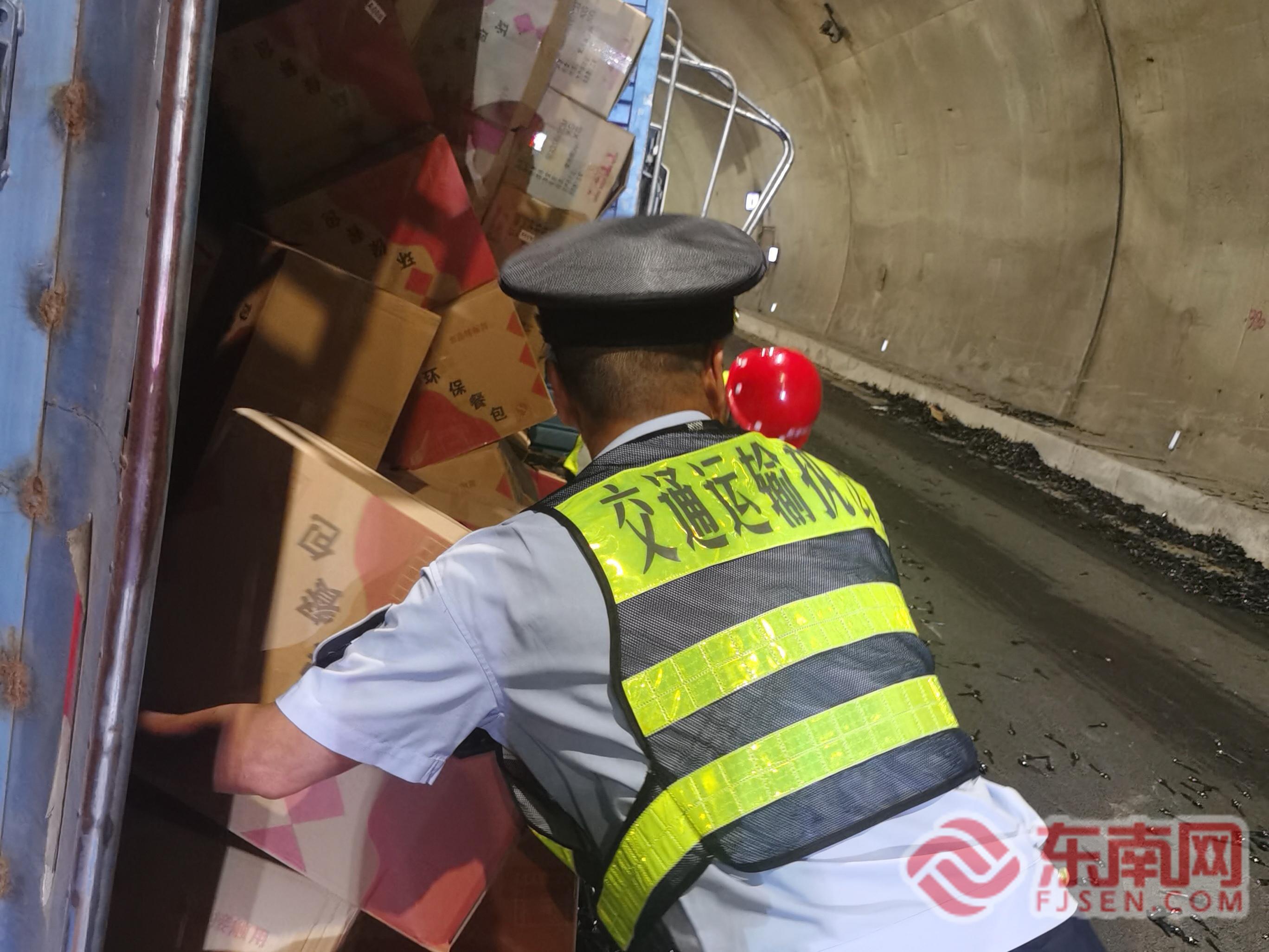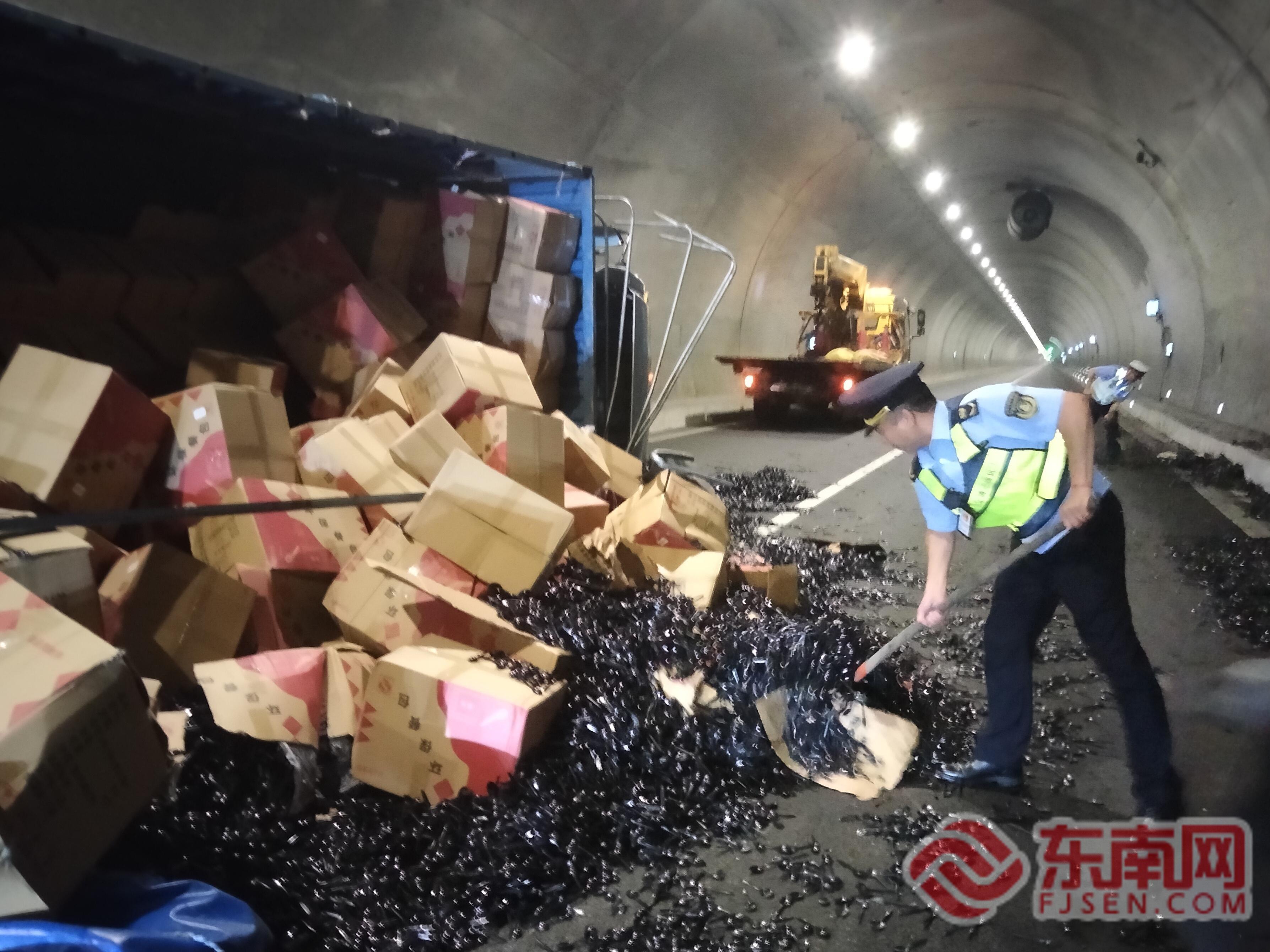 东南网8月1日讯(通讯员 李思澄 王礼木)7月30日22时07分,宁德高速执法支队柘荣中队接路网中心紧急通报:甬莞高速B道430K+0M处隧道内,一辆运输餐饮勺子的货车发生侧翻,大量货物散落,严重阻塞隧道通行。