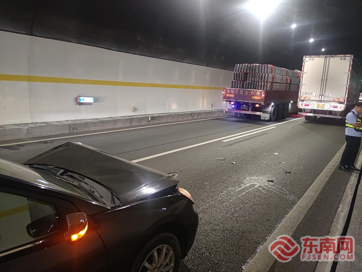 追尾事故现场 彼时,岗上隧道内车流密集,执法员巡查至该路段时,发现一起追尾事故。虽无人员伤亡,但受损的小轿车停滞在主车道上,极易引发因拥堵造成的二次事故。执法员凭借敏锐的职业嗅觉和节日保畅的高度责任感,立即启动应急处置措施:迅速在事故现场后方设置安全防护区域,利用警示标志和手势引导后方车流有序避让,为事故处置筑牢安全屏障。