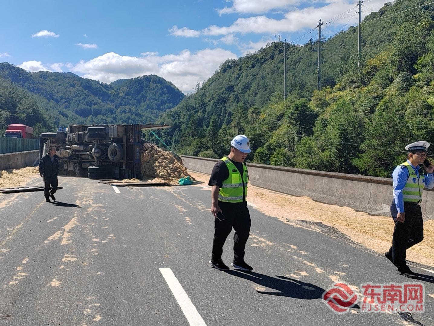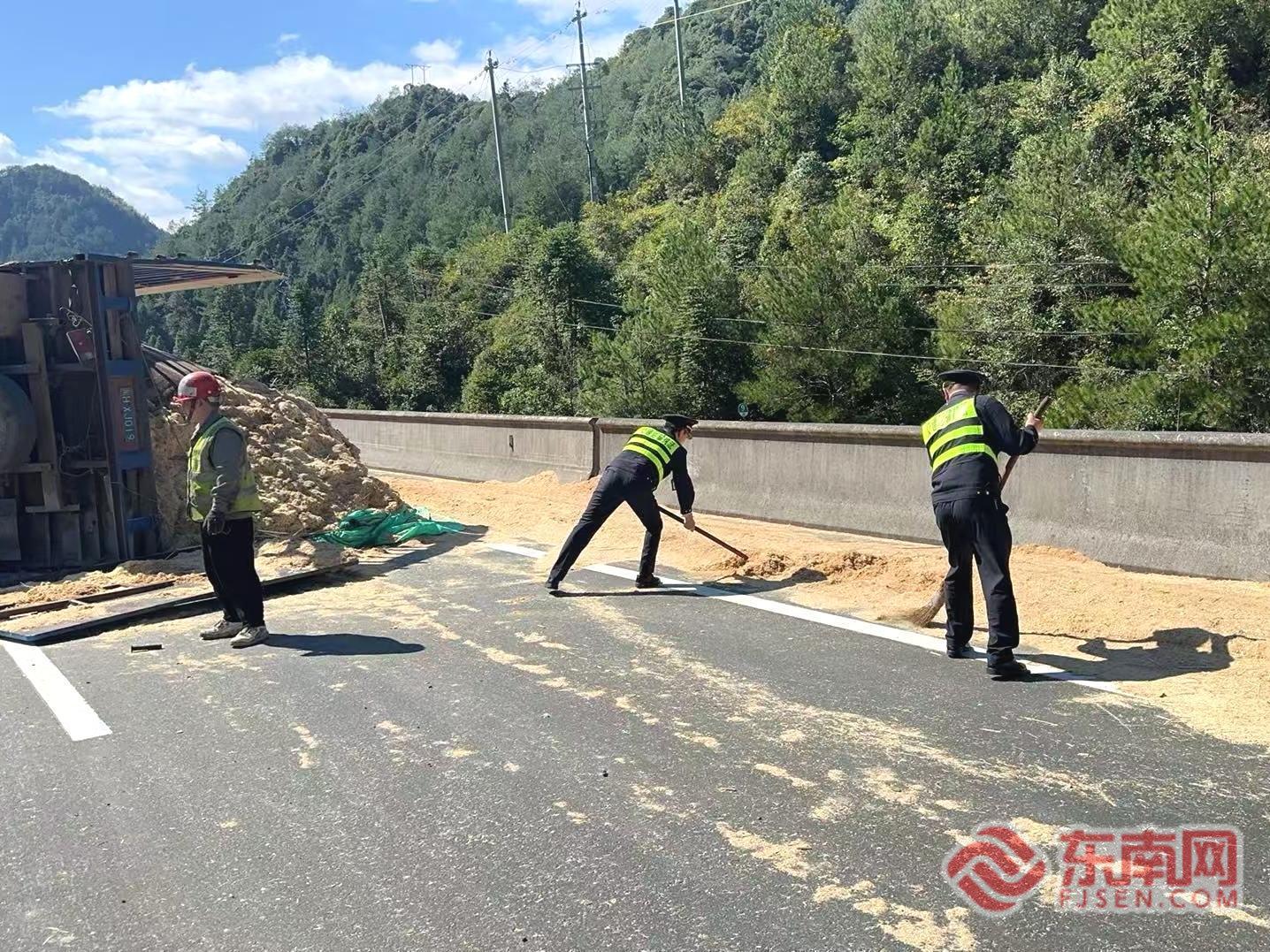 高速货车侧翻锯粉洒落 多部门协力三小时排险