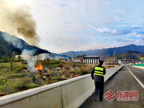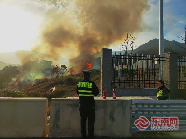 火势蔓延至高压电塔附近。宁德高速公路行政执法支队供图 “险情就是命令,人民至上是行动准则。”面对紧急态势,路巡执法人员没有丝毫迟疑,第一时间靠边停车启动应急处置程序。执法人员迅速分工,一组快速在火情影响区域设置安全警示标识,引导过往车辆减速避让;另一组立即启用通讯设备,于15时40分拨打119消防报警电话,详细说明火情位置、蔓延态势及周边关键设施分布,同时同步联系洋中乡镇府请求协同处置,构建起“快速响应、多方联动”的应急处置格局。