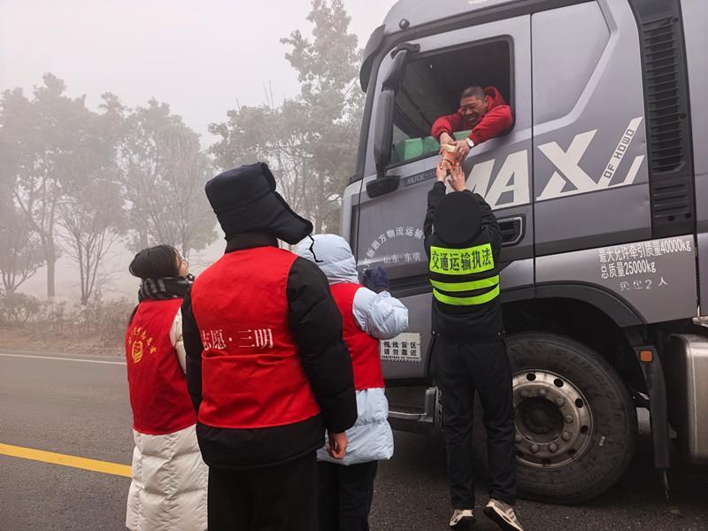随着除冰作业完成,道路恢复通行,车队缓缓启动。驶离前,不少司机特意摇下车窗,向仍在寒风中值守的志愿者们点赞,挥手致意。