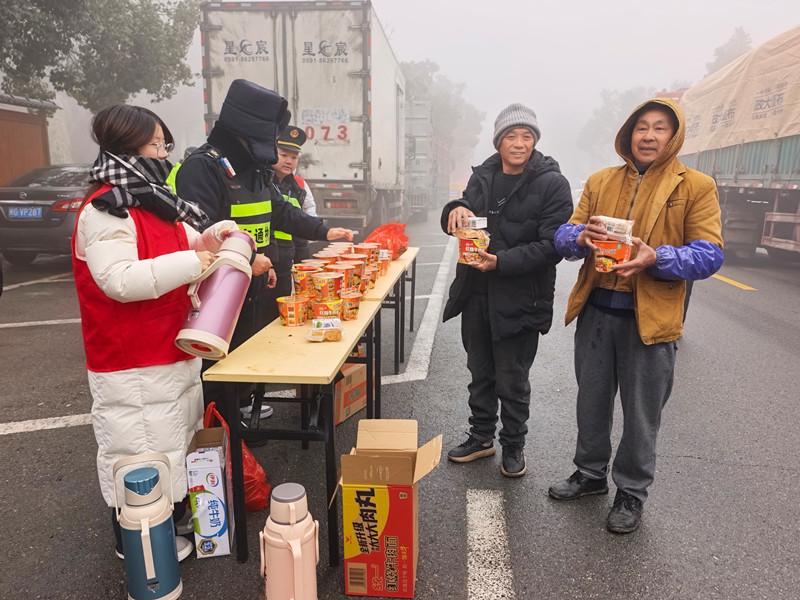 “师傅们,这边有热水、有吃的,需要什么自己拿。”身着红色志愿服的志愿者在茫茫大雾中格外醒目。听见招呼声,原本坐在驾驶室等待的司机们闻声而来,渐渐在桌前聚拢。一位老师傅端起热气腾腾的开水,暖了暖冻得发僵的双手;志愿者主动为司机们泡好泡面,香气很快飘散开来。一杯杯冒着白气的热水,一碗碗泡好的方便面,一盒盒温热的牛奶和面包,被递到一双双有些冰冷的手中。来自江西的货车司机李师傅捧着热水,连声道谢:“这真是雪中送炭啊!”
