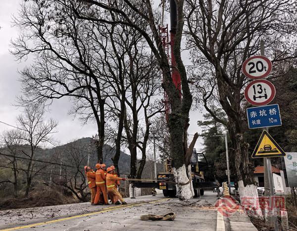 建宁公路部门清理危树 。 建宁公路分中心迅速响应,立即启动应急预案,组织均口公路站养护人员8名、路政人员4名,并调配吊车1辆、养护车2辆,火速赶赴现场。抵达后,路政人员第一时间设置安全警示标志,有序疏导现场交通。养护人员则根据既定方案,在吊车的辅助下,先将开裂的树枝稳妥吊起,随后使用电锯将危险树干分段截断,并缓慢放置至路面安全区域。经过细致地用扫帚将路面遗留的木屑、碎枝清扫干净,全面恢复了道路原貌。