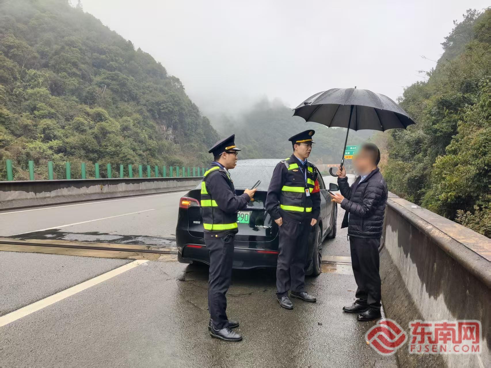 执法人员帮助驾驶员上报信息,联系拖车。宁德高速执法支队供图 执法人员立即停车,联合现场高速交警、路勤人员迅速实施现场布控,将反光锥延伸至弯道入口,并指挥后方车辆提前变道,为随后赶来的拖车施救创造安全空间,快速将故障车转运到古田收费站出口送修,处置全程高效紧凑,及时恢复了道路畅通,帮助驾驶员在一小时后顺利继续返程。