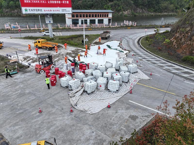 “接报后,我们第一时间抽调16人、调配4台车辆赶赴现场,抓实安全管控。”尤溪公路分中心安全路产股股长林久润介绍。由于胶水属于危化品,不能简单使用洒水车高压冲洗处理,分中心科学制定“覆盖吸附+人工清理”方案,先用铁桶装运胶水,再以沙子覆盖搅拌后运离,最后进行人工清扫,处理难度较大。全体应急抢险人员轮班奋战,连续鏖战约7小时,成功清理现场,恢复道路畅通。