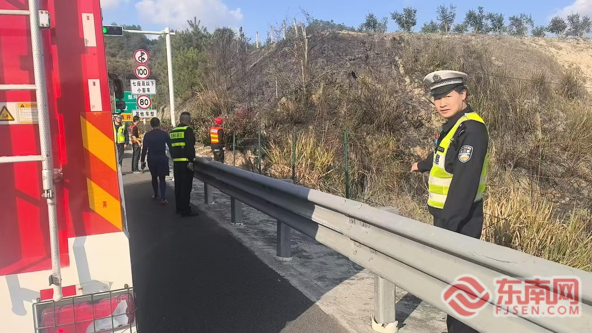 东南网4月1日讯(通讯员 姚晨 戚盛楠)近日,政永高速B道34K+840M路段边坡突发火情,火势快速蔓延,极易引发次生事故,严重威胁道路通行安全与路产完好。宁德高速执法支队屏南中队接警后立即进行应急处置,依托“5+N”多部门联勤联动机制,快速联动高速交警、消防救援、公路养护等单位,高效开展火情扑救、交通管控与隐患处置,全力守护群众出行安全。