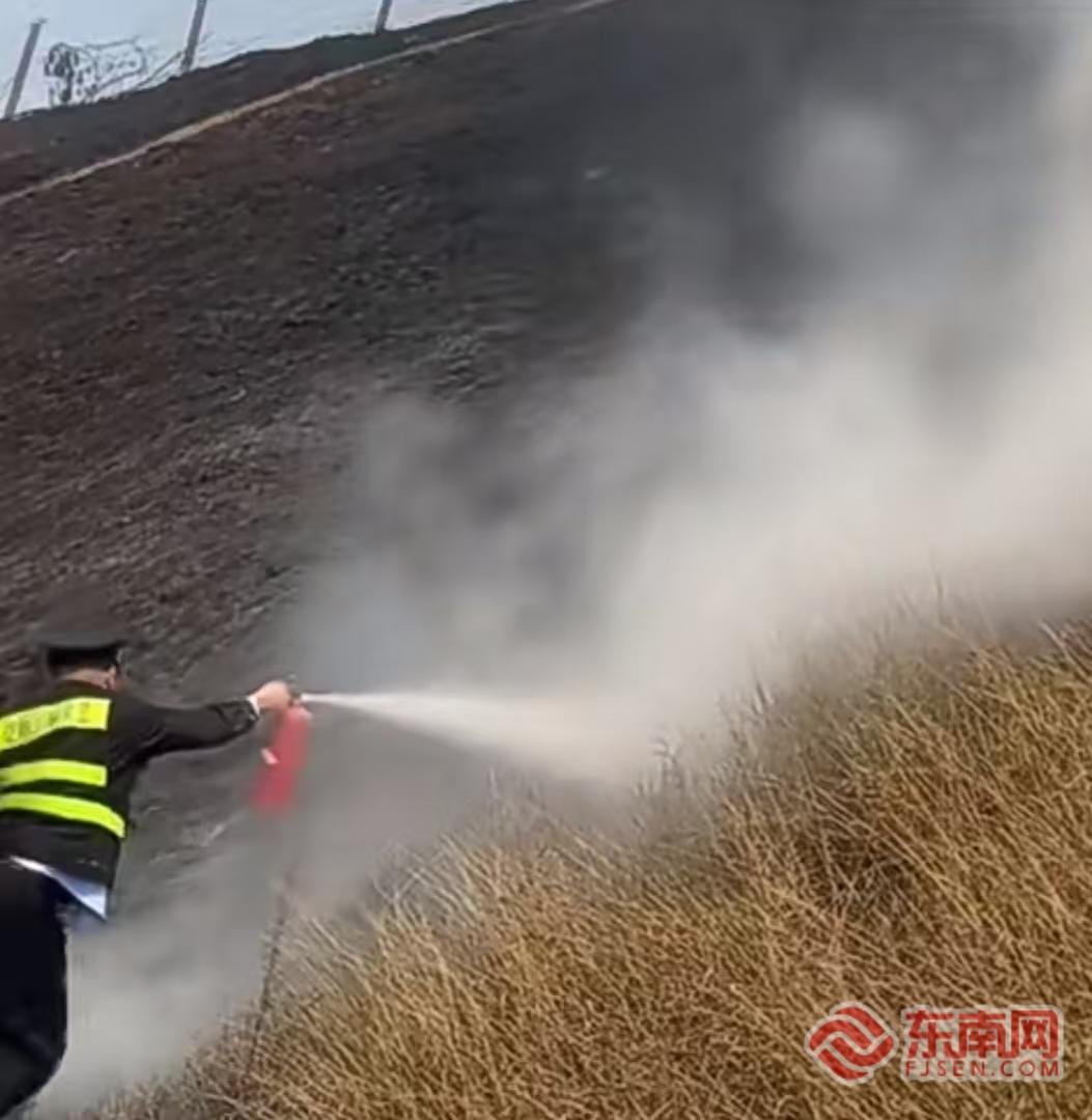 执法人员清除零星火苗。宁德高速执法支队供图 执法人员第一时间抵达现场,迅速开展现场布控、警戒疏导、先期处置:在火情路段上下游规范布设警示标志、反光锥桶,开启警灯警报,实施临时交通管控,有序分流过往车辆,开辟应急救援通道;同时使用车载灭火器材压制明火,清理边坡易燃杂物,阻断火势扩散,同步开展路产勘验取证,严防次生事故发生。
