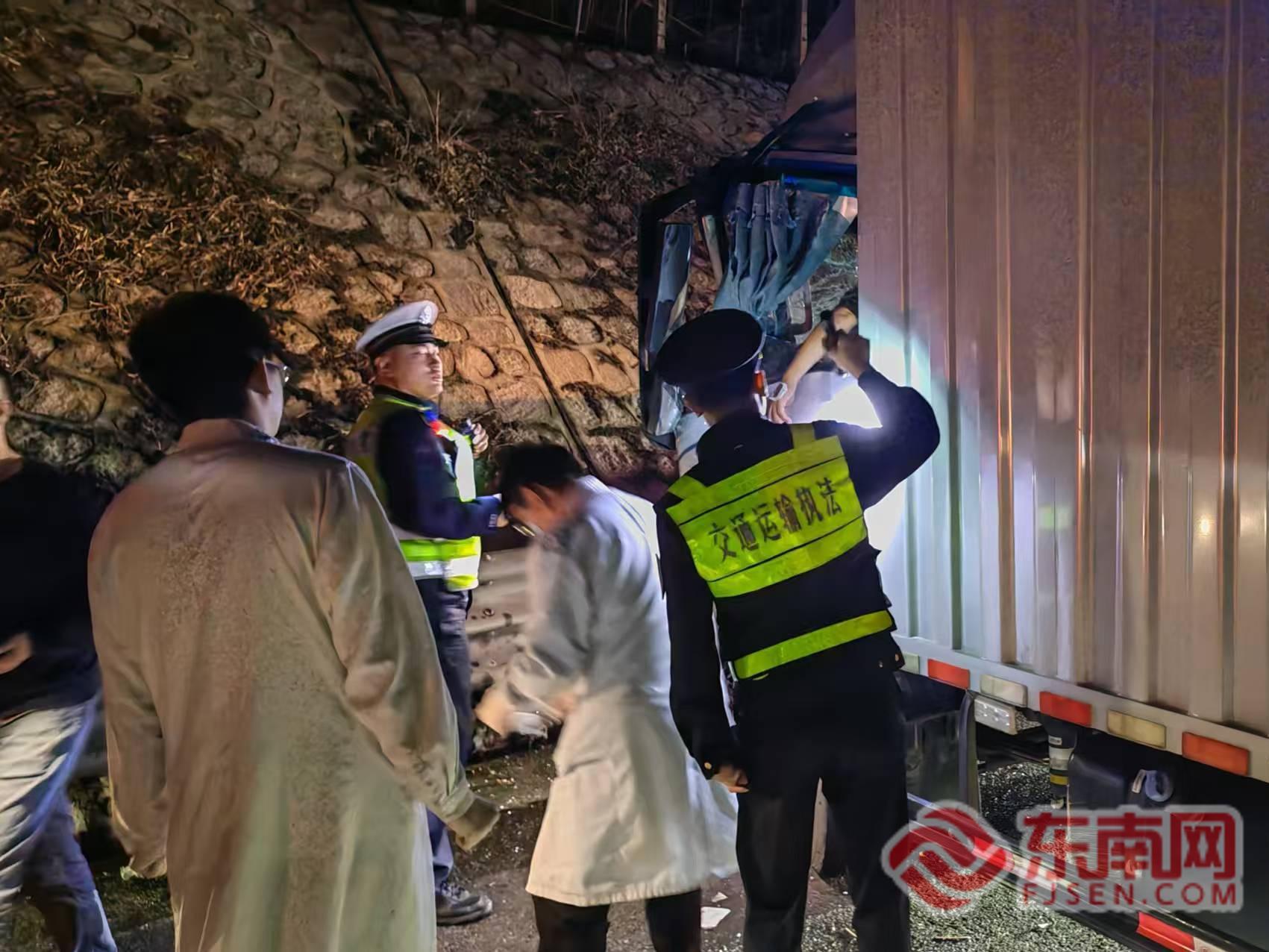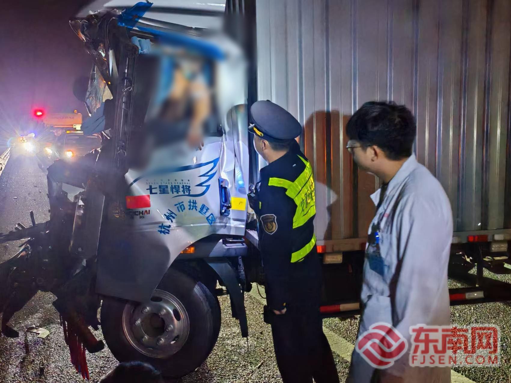 救援现场。宁德高速执法支队供图 经现场勘查,事故导致其中一辆货车驾驶室严重变形,驾驶员被牢牢卡在驾驶室内,身体受伤且情绪紧张。此时,高速执法人员与交警一同持续在驾驶室旁轻声提醒驾驶员保持清醒,耐心安抚其紧张情绪,不断与驾驶员沟通交流,稳定其状态,为后续救援争取宝贵时间。
