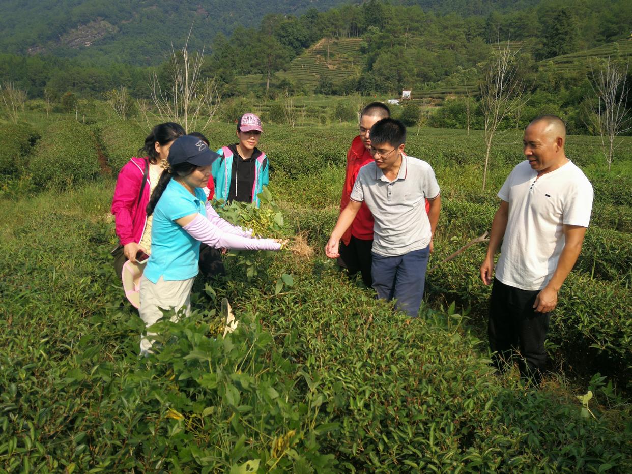 廖红教授(右2)在武夷山燕子窠福莲生态茶庄园介绍科学利用作物提高茶叶产量、提升茶叶品质、减少茶树病虫害方法。 福建日报记者 林熙 摄