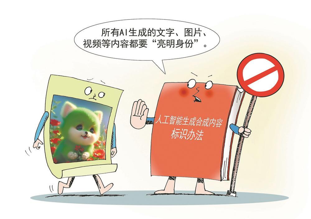 9月1日起正式施行的《人工智能生成合成内容标识办法》明确,所有AI生成的文字、图片、视频等内容都要“亮明身份”。这一规定倒逼平台升级审核机制,有利于保障用户信息获取的透明度与可信度,压缩AI造谣、AI侵犯著作权等违法行为的生存空间。在阳光下,AI会跑得更快更稳。不过,要使规定真正落地,还需要织密“技术、监管、追责”三张网,让恶意删除、窜改、伪造、隐匿AI生成合成内容标识成为一件难度高、代价大的事,避免出现阳奉阴违、打擦边球现象。(朝阳/文 沈海涛/图)