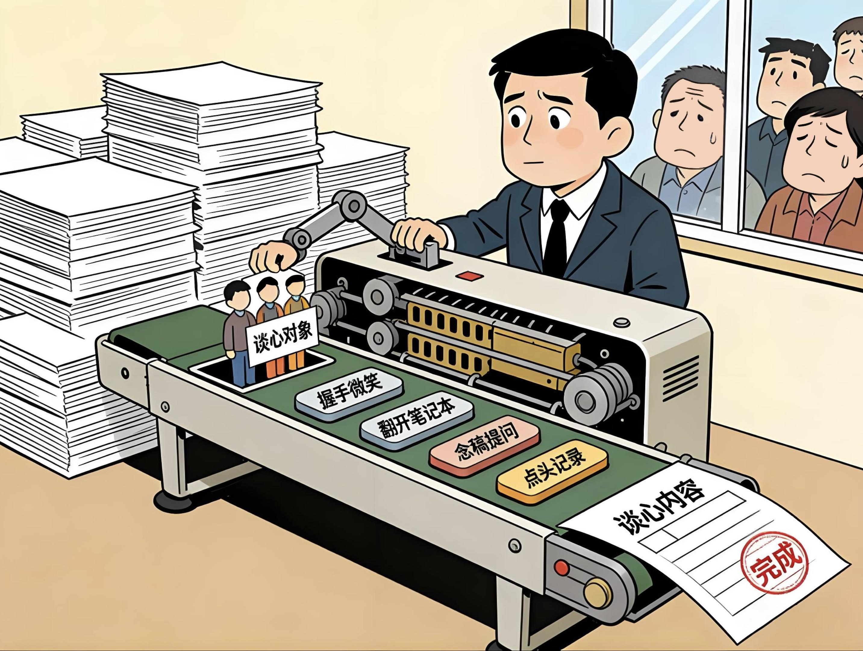 谈心谈话这一常态化机制,本是单位领导倾听心声、化解心结、凝聚合力的好机会,可在一些地方却走了样。有的照着清单念、对着表格填,把交心变成了交差;有的只聊家常、不谈问题,把严肃交流变成了轻松闲聊;还有的谈完就归档,问题依旧悬着,让制度成了“纸面功夫”。这种走过场式的谈话,看似程序到位,实则毫无温度,更难有实效。