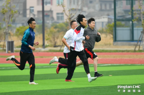 “闽超”平潭队台胞球员李振瑄(右一)和队友进行日常训练。