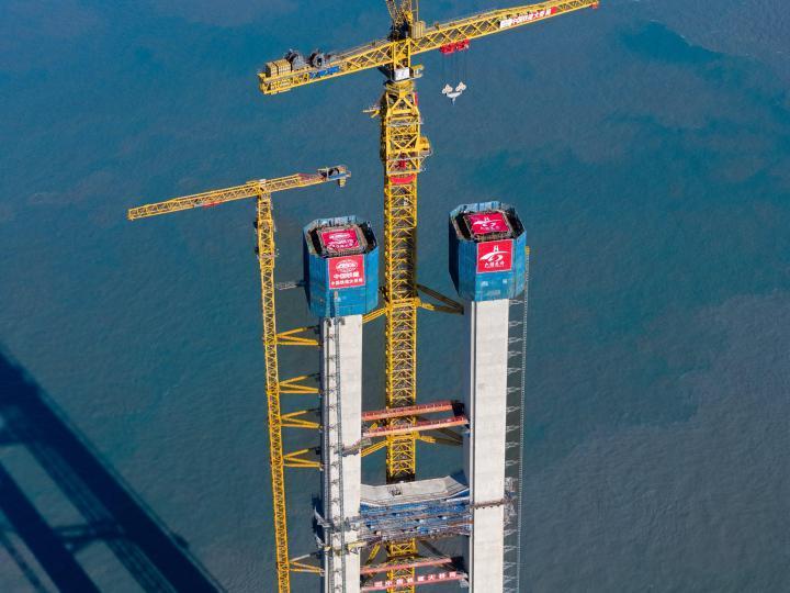 9月6日,随着第44节塔柱混凝土浇筑完成,由中国铁建大桥局承建的宁波舟山港六横公路大桥二期工程双屿门特大桥首个主塔顺利封顶。双屿门特大桥连接舟山六横岛与佛渡岛,主跨达1768米,建成后将成为国内最大跨度跨海桥梁。