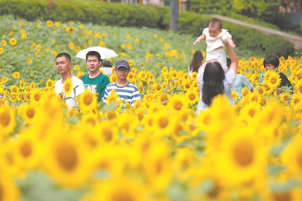 9月20日,位于福州市仓山区的福州花海公园,金灿灿的向日葵在阳光下尽情绽放,吸引市民前来打卡赏花,感受秋日花海美景。