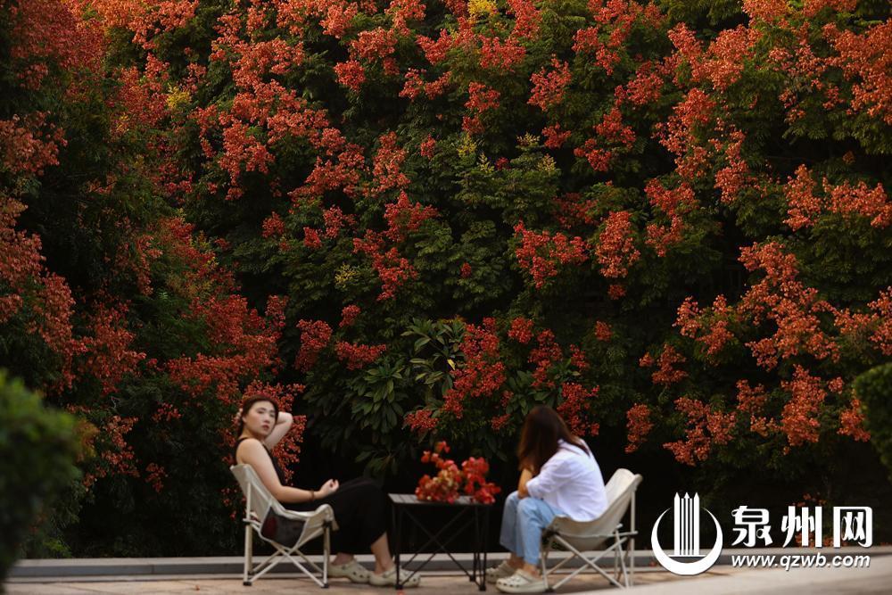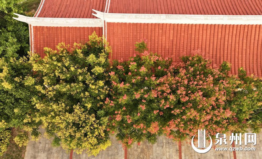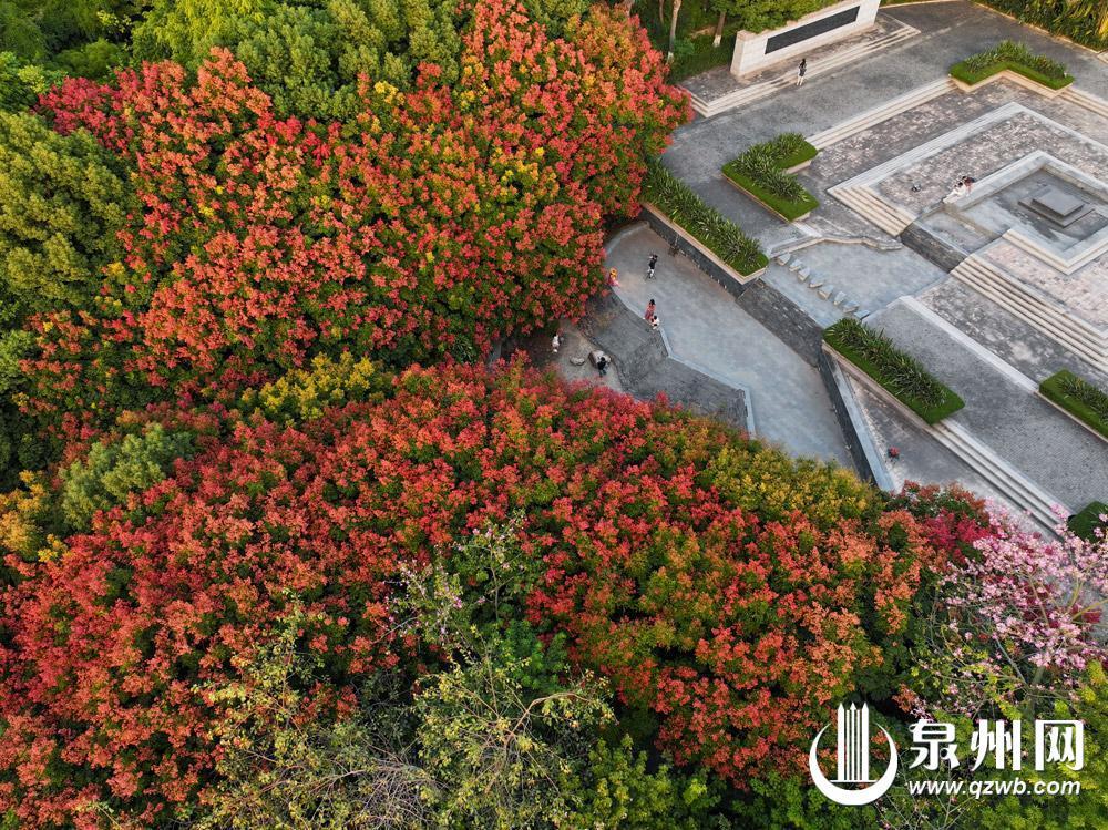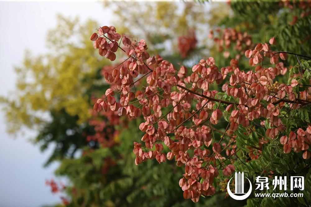 秋日里,泉州市区大坪山藏着一场不期而遇的色彩盛宴。近日,山上的五彩栾树进入盛花期,细碎的黄花、鲜红的果荚与翠绿的叶片交织,从山脚蔓延至山腰,宛如大自然打翻了调色盘,吸引不少市民专程登山打卡,朋友圈里满是这片“秋日花海”的身影。 沿着大坪山健身步道向上走,未到山顶便被亮眼的色彩拦住脚步。近百株栾树错落分布在步道两侧,树干笔直挺拔,抬头望去,树冠像撑开的巨大花伞,细碎的金黄色小花缀满枝头,风一吹便簌簌落下,铺成一层“黄金地毯”。花谢后结出的三角状果荚,初时是淡绿色,渐渐染上粉红、朱红,最终变成深褐色,远远望去,像挂在枝头的小灯笼,又似一串串五彩铃铛,在阳光下泛着光泽。金黄的花簇、火红的灯笼果与烂漫的粉霞交织碰撞,铺展出层次丰富的秋日画卷——抬眼望去,一层青绿、一层鹅黄、一层绯红、一抹轻粉,它们错落交织于山间,与山顶巍然矗立的郑成功骑马塑像遥相呼应,历史的气韵与自然的生机彼此交融。(东南早报融媒体记者 林福龙 庄丽祥 通讯员 许晓岚 文/图)