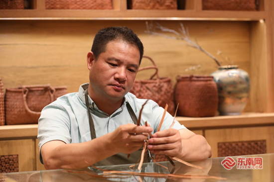 山葡萄藤编。永泰县文化体育和旅游局 供图 “非遗+”实现传承新发展。“十四五”期间,永泰积极培育山葡萄藤编、永泰菜篮公、永泰李干、永泰葱饼、山茶油熏鸭技艺、烤兔制作技艺、盖洋红等非遗产业,年均总营收超过1000万元,实现文化传承与经济效益双赢。
