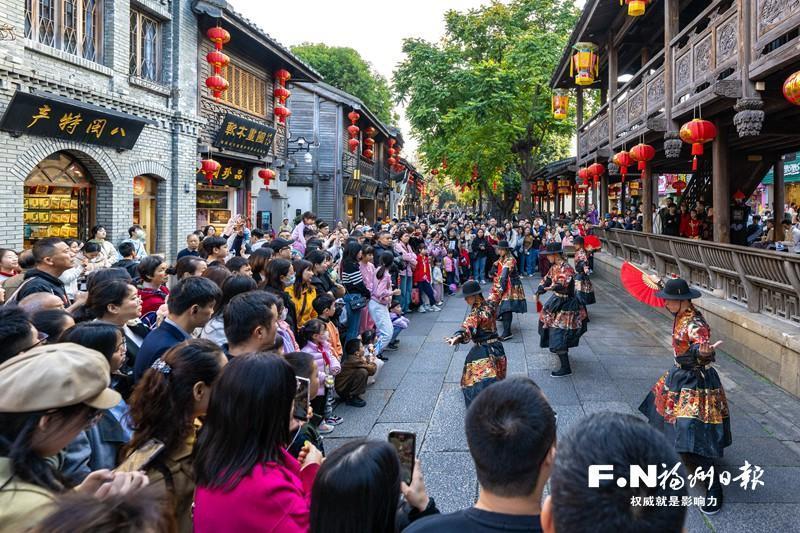 三坊七巷内的沉浸式表演吸引许多游客驻足观看。记者 林双伟 摄 以文塑旅 旅途焕彩 金秋十月,第五届烟台山文化艺术季将整个烟台山街区打造成开放式美术馆,户外装置艺术与百年老建筑相得益彰。“艺术已经完全融入了街区的肌理!”来自上海的摄影师张先生一边捕捉光影,一边赞叹道。国庆中秋假期里,烟台山客流量达92.2万人次,日均客流量超10万人次,成为展现福州文艺气质的重要窗口。 “十四五”以来,福州通过场景、文化与体验的紧密结合,让旅游不断焕发出新的活力。从节庆旅游到非遗手作体验,再到“为展赴城”(指因特定展览活动而专程前往某城市)的新风尚,富含文化底蕴的旅游新业态持续“出圈”,精准契合游客需求。 传统非遗的创新演绎,更让旅途有了深层文化共鸣。在福州评话伬艺传习所剧场,互动式闽剧《三山旧梦》让年轻游客曾凡眼前一亮:“没想到闽剧能这么时尚!”该剧音乐总监陈强带领团队保留《茉莉花》《叹四季》等传统曲牌原有韵律,融入现代编曲手法,让老戏迷能品出传统韵味、新观众也觉悦耳动人。