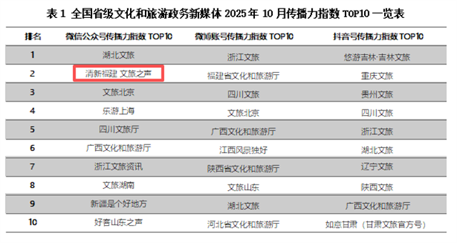近日,文旅产业指数实验室发布“全国省级文化和旅游政务新媒体2025年10月传播力指数TOP10榜单”,福建省文化和旅游厅官方微信公众号“清新福建文旅之声”共发布推文121条,获得总阅读量75万+次,转发数3.3万+。点赞总数和推荐总数全国最高,分别为10760次和5829次。凭借各项优异的传播数据,“清新福建 文旅之声”微信公众号在TOP10榜单上排名全国第二名。