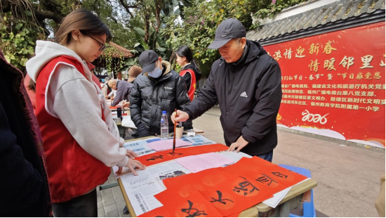 新春将至,年味渐浓。为传承和弘扬中华优秀传统文化,让社区居民在浓厚的文化氛围中感受新春的温暖与祝福,2026年1月29日,福建省文化和旅游厅机关党委联合福建省广播电视局、福州市鼓楼区河东社区、福建民俗博物馆、福州广播电视台第八党支部、福州教育学院附属第一小学共同开展“墨香浓情迎新春 情暖邻里送祝福”——2026年“我们的节日·春节”暨“节日感党恩 共话新时代”主题活动。辖区居民、企业人才代表、市民代表、辖区台胞等共同参加。