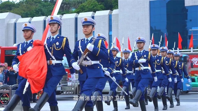 这支以“90”后为主, 平均年龄只有23岁的护旗队伍 来自福州三坊七巷中队国旗护卫队 他们是全国唯一一支 担任省会城市升降旗任务的消防队伍