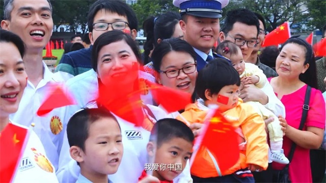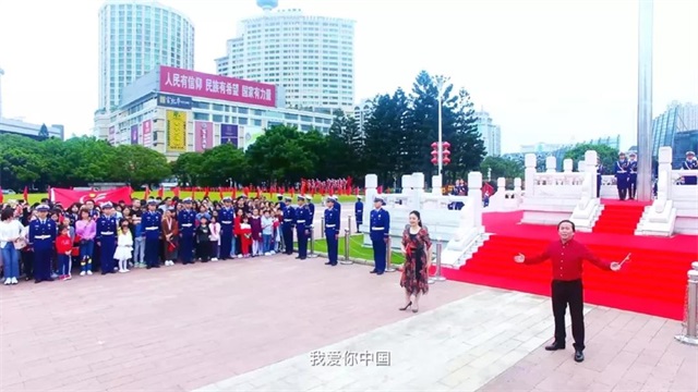 “百灵鸟从蓝天飞过, 我爱你中国,我爱你中国……” 正当五星红旗在蔚蓝的天空上飘扬 广场上忽然响起了人们熟悉的旋律 ——《我爱你,中国》