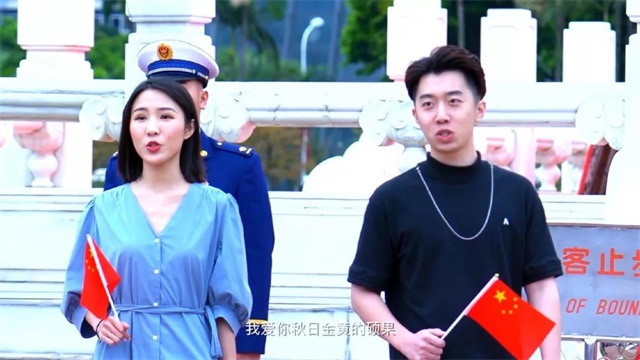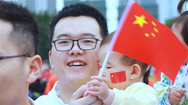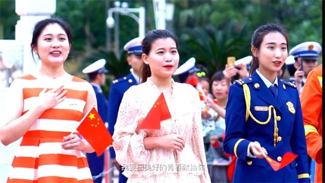 “我爱你中国,我爱你中国, 我要把最美的青春献给你, 我的母亲我的祖国。” 当快闪活动临近尾声时 大家奋起双臂挥舞着国旗 把现场的欢乐燃到了顶点