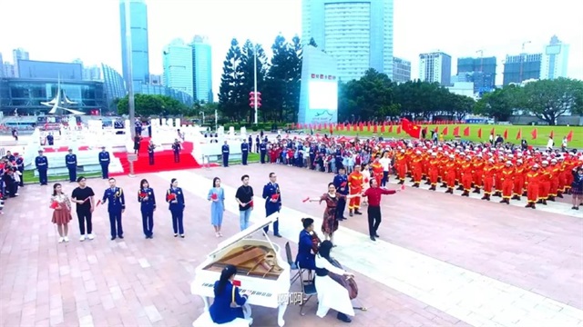 福建师范大学音乐学院的两位老师 从国旗台两侧边走边唱缓步来到广场中间 随后多位身着“火焰蓝” 橙色救援服的演唱者 和师生从不同方位向中心汇集 原本安静的人群霎时热闹起来