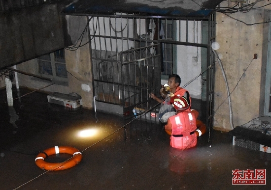 6月10日4时9分,三明三化一村19栋1楼房屋被淹,房间内一名60岁左右的老人被困,接到报警后,三明消防救援支队特勤中队迅速组织救援力量赶赴现场。在现场,消防指战员看到三化一村已经出现严重积水,水深已经到达了成年人的腰部。不少小轿车的车轮已经被淹。沿着楼梯,消防指战员涉水来到老人身边,指导老人穿上救生衣,并佩戴好救生圈,同时通过安全绳的引导,将老人转移到安全地带。