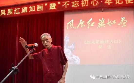 96岁抗战老兵郝滔在宣讲 图片来源:三明日报 不忘初心使命当好薪火传人 “革命烈士林大蕃抛头颅、洒热血,换来我们今天的幸福生活,作为96岁的幸存者,我有理由有必要把这段红色历史讲解好,让更多的人牢记,好好学习、好好工作,干好每一天……”抗战老兵郝滔是此次红色三明故事宣讲比赛中最年长的选手,比赛中,郝老全程站立脱稿演讲,由他原创的红色三明故事《红色太阳映红大田》,条理清晰、激情澎湃,把感人的红色故事和自己的“初心”与“使命”一一呈现,催人泪下。 “我很真切地感受到了那件棉衣真的好温暖。这次参加红色三明故事宣讲,让我对革命先辈的英雄事迹有了更多更深的了解,我一定好好珍惜现在的幸福生活,好好学习,做新时代的好少年。”10岁的戴晨希是年龄最小的参赛者,比赛中她娓娓道来《一件棉衣》,获得了全市总决赛学校组二等奖。 “收条中提到的肖瑞兰同志是我的外公……这张‘红色’收条,它传承着红色基因,凝聚着红军的汗水,饱含着建宁人民对毛主席的深情,也寄托着领袖对建宁老区人民的厚爱。虽然外公离开我们多年,但外婆常用外公在世时说过的话要求我们:‘要听党的话,要做对国家和社会有用的人。’在这份初心的感召下,外公外婆的子孙后辈们在各自的工作岗位上积极进取,努力践行着听党话、跟党走的誓言。”选手林菲宣讲的《一张“红色”收条》,深深打动了在场观众。 尤溪县坂面镇京口村是三明市首批“中央红军村”,闽赣省机关曾在这里开展艰苦斗争,京口村的红色故事宣讲活动就在闽赣省苏维埃政府旧址举办。一个个感人故事把闽赣省机关以及红军战士在尤溪的战斗事迹娓娓道来。观众们纷纷表示,要持续把京口村的红色传统发扬好、把红色基因传承好、把红色资源利用好,打响“风展红旗如画”红色品牌。“这里是个神圣的地方,我对这里充满了信心,相信在党的领导下,我们京口村村民的生活一定会越来越好。”京口村宣讲员张上才激动地说。 不论是普通党员干部还是烈士后人,不论是在革命遗址还是场馆舞台,红色故事被一遍遍深情讲述,三明儿女在共同感受信仰光芒中坚定传承榜样力量的决心。