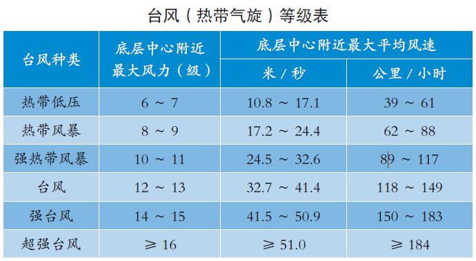 国家《热带气旋等级》(GB/T 19201—2006)标准规定,热带气旋按其底层中心附近最大平均风速划分为热带低压、热带风暴、强热带风暴、台风、强台风、超强台风6个等级。