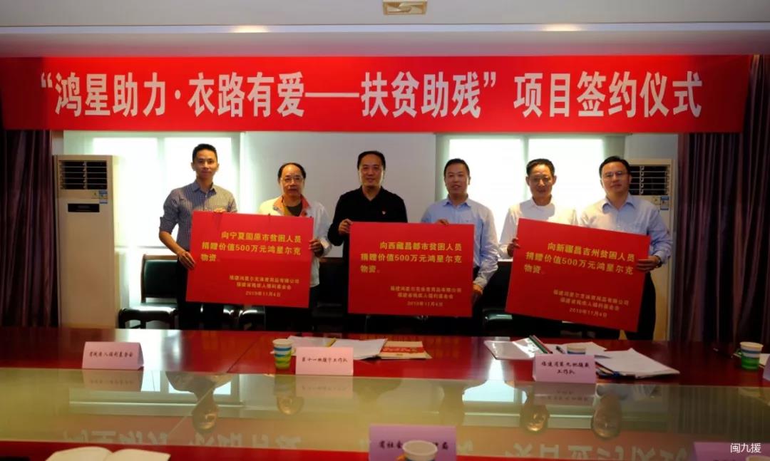 感谢信全文如下↓↓↓ 福建鸿星尔克体育运动用品有限公司: 贵公司与福建省残疾人福利基金会合作开展的“鸿星助力·衣路有爱——鸿星尔克扶贫助残活动”项目这次能够花落昌都,这是对福建援藏工作队最大的支持,给予了我们极大的物质上的帮助和精神上的鼓励,也给昌都人民送来了一个温暖的冬天。在此,谨让我们,同时也代表昌都市的所有残疾、贫困家庭,向贵司致以崇高的敬意和衷心的感谢! 2019年7月15日,福建省第九批援藏工作队进驻昌都市,开启为期三年的援藏之路。关爱弱势群体、助力脱贫攻坚,是福建援藏工作队的一项重要任务,昌都市委、市政府及广大贫困农牧民对我们寄予了很大期望,我们深感责任重大、使命光荣。长期以来,贵公司矢志不渝致力于慈善事业,以实际行动践行“乐善好施”的福建精神。你们的善行义举,充分体现了扶贫济困的责任担当,彰显了福建企业反哺社会的慈善温情。 大爱无疆,情暖昌都。让我们携起手来,共同造福昌都百姓,让慈善之光在雪域高原绽放异彩。最后,衷心祝愿贵公司事业兴旺发达,更上一层楼!扎西德勒! 福建省第九批援藏工作队 2019年11月1日 11月4日,由福建省残疾人福利基金会、福建鸿星尔克体育用品有限公司主办的“鸿星助力·衣路有爱——扶贫助残项目”捐赠福建省省对口支援西藏昌都、新疆昌吉、宁夏固原签约仪式在福州举行。福建省社会组织管理局局长郭奇,福建省残联理事长邵旭、教就部副部长游水平,福建省残疾人福利基金会理事长刘新明、副理事长陈振环、副秘书长余一澜及福建省第九批援藏工作队、福建省对口支援新疆工作前方指挥部、福建省第十一批援宁工作队相关代表出席仪式。