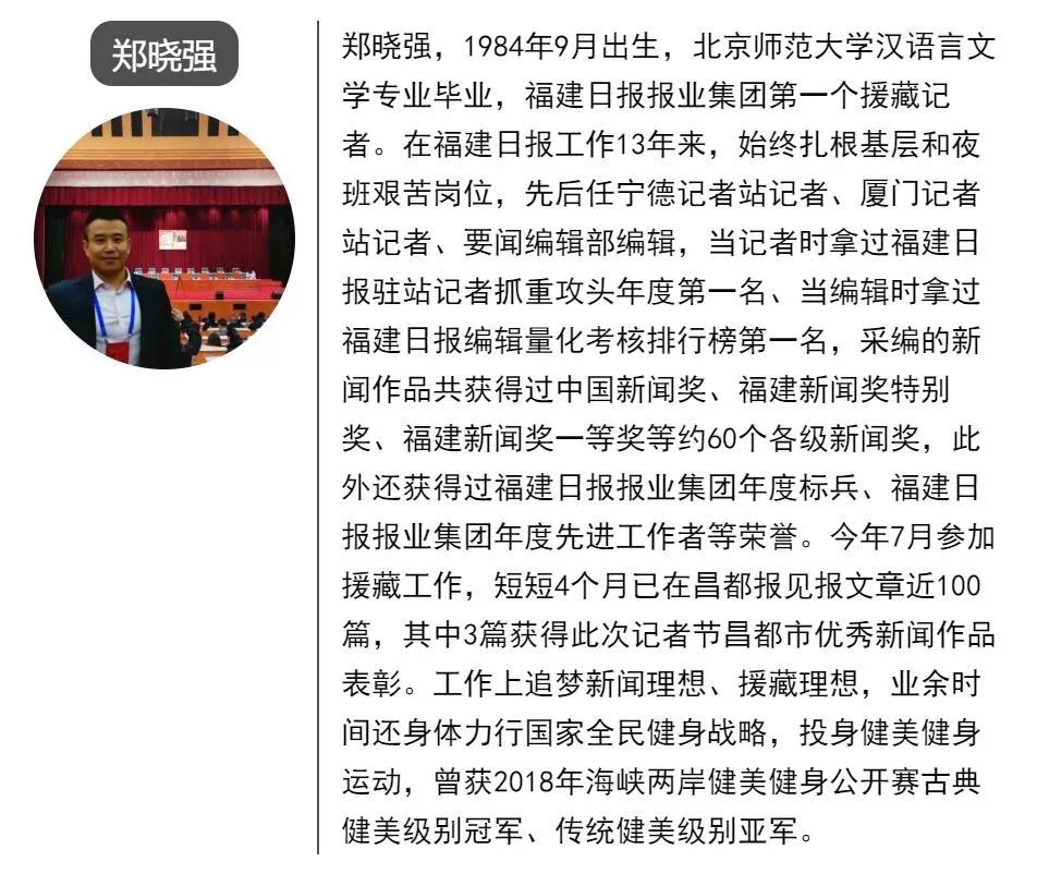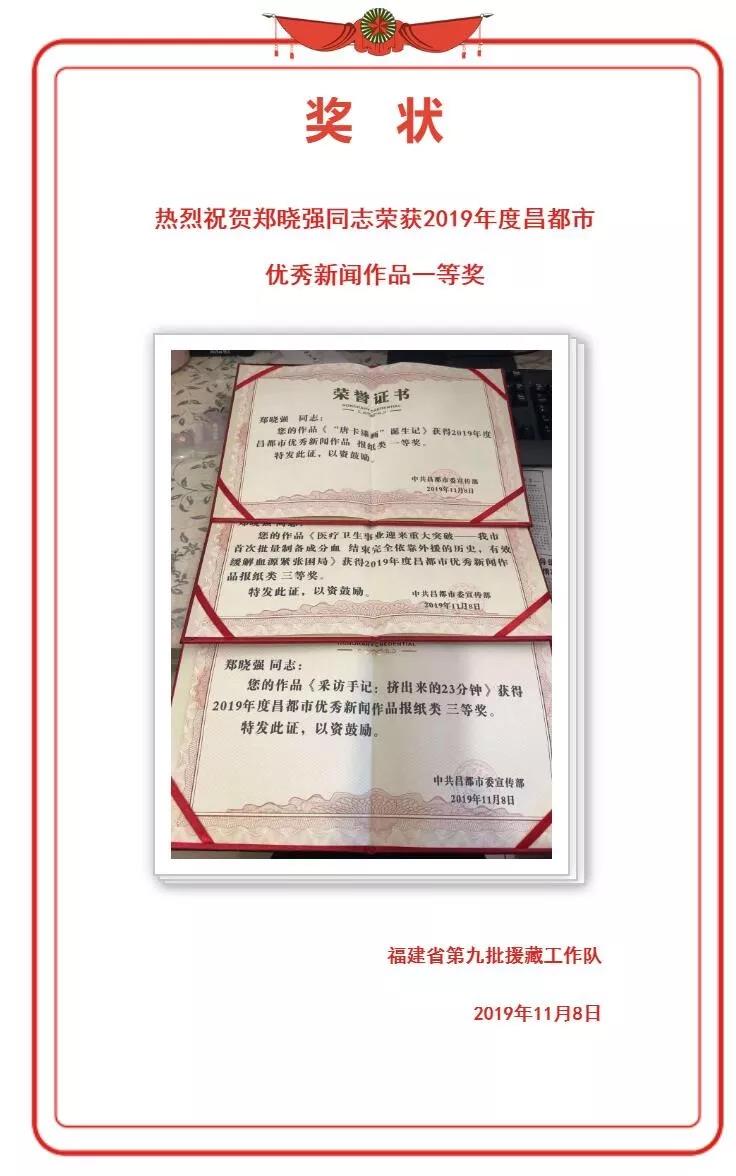 11月8日,在第20个记者节来临之际,福建日报要闻部记者、昌都报记者、福建省第九批援藏工作队郑晓强的《“唐卡漆画”诞生记》等三件新闻作品,喜获昌都市2019年度优秀新闻作品一等奖和二个三等奖,实现了援藏新闻领域的突破。