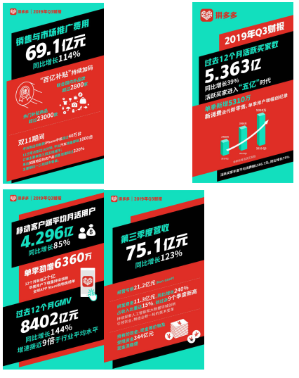 用户规模增长创新高 核心数据增速持续大幅领跑 财报显示,截至2019年9月30日,拼多多年活跃买家数达5.363亿,较去年同期的3.855亿净增1.508亿,较上一季度的4.832亿净增5310万,创上市以来最大单季增幅。 自上市以来,拼多多用户增速持续大幅领跑全电商平台,成为行业最大的用户和包裹增长源。拼多多的崛起,有效打破了中国城乡二元消费结构,使得低线城市以及乡镇地区的用户,可以享受同等于一线城市的消费平权,有效推动了中国内需市场实现大规模消费扩容。 除引领下沉市场外,依托新电商模式的结构性成本优势,拼多多长期践行“同品最低价”策略,有效满足了最广大用户对于商品价格的基本诉求。在此推动下,拼多多迅速成长为中国新中产群体的主要消费渠道之一。Sensor Tower的数据显示,2019年以来,拼多多持续领跑全球APP Store购物类榜单,成为全球苹果用户下载量最大的中国应用。 三季度,拼多多进一步扩大“多实惠、多乐趣”的领先优势,不断开拓虚拟现实相结合的新消费场景,深入满足用户购物之外的深层次需求。在此推动下,三季度,拼多多APP平均月活跃用户数大幅增长至4.296亿,单季净增6360万。过去的两个季度里,拼多多APP月活用户数净增1.399亿。 基于用户规模和信赖度的大幅攀升,截至2019年9月30日的12个月期间,拼多多平台GMV达8402亿元,较去年同期的3448亿元同比增长144%。期间,平台活跃买家年度平均消费额进一步增长至1566.7元,较去年同期的894.4元增长75%。 国家统计局数据显示,截至2019年9月,全国网上零售额的名义同比增长为16.8%,上述数据表明,拼多多的增速接近9倍于行业平均水平。 引领新消费浪潮 构建“人为先”商业体系 作为中国新消费浪潮的主要推动者,拼多多始终致力于打破现有供需结构的不平衡和不匹配,推动上下游实现更合理的价值分配。 自上世纪90年代至今,中国消费市场始终是强渠道思维,经销商体系、商超、电商平台等渠道方先后主导了商品的分发与转化模式,决定了品牌的培育和发展体系。该模式确立了相对稳定的人货逻辑,但也在很大程度上导致了商品溢价普遍过高、商品有效供给率不足,以及本土品牌羸弱等现象。 为了深入满足中国消费市场持续迭代的深层次需求,自创立以来,拼多多始终坚持以消费者为导向,致力于建立以人为核心的新商业体系,让价值能够真正回归生产者和消费者。 需求层面,拼多多持续弱化包括平台本身在内的渠道属性,推动中间不合理价值回补两端,让消费者享受更多实惠;流通层面,拼多多尝试建立以人为颗粒度的商品分发模式,让用户成为渠道的主体,构建以真实产品体验为基石的品牌体系;供给层面,基于领先的技术和大数据应用,拼多多联合中国顶尖制造企业,以消费者的实际需求主导新品研发和生产,通过商品优势建立品牌认知,从而构建起一套不同于传统西方传统商业逻辑的市场体系。 领先的理念与实践,推动平台实现了跨越式发展。2019年,拼多多推出“百亿补贴”计划,帮助品牌商通过旗下热门商品迅速开拓增量市场。通过该计划,包括Apple MacBook、戴森吹风机等在内的逾万款全网最热商品,均实现了前所未有的最低价。 截至目前,拼多多“百亿补贴”入口的日活用户已经突破1亿大关,参与计划的国内外品牌超过2800家,热门补贴商品超过23000款。 供给层面,拼多多推出的“新品牌计划”,已经发展成为互联网与制造业深度结合的标杆。截至今年9月底,“新品牌计划”正式成员已达85家,超过800家包括知名品牌在内的企业参与了C2M定制化生产。三季度,平台以日用百货、智慧家电为主的新品牌产品,累积订单量超过2700万单。 基于“以需定产”的模式和“人为先”的商业体系,拼多多已经成为新生代本土品牌的主要源发地之一。 营收增长123%至75.139亿 非通亏损21.235亿元 可动用现金超400亿元 财报显示,三季度,拼多多实现营收75.139亿元,较去年同期的33.724亿元同比增长123%。 营收增长主要来源于平台在线营销技术服务收入的强劲增长。三季度,拼多多在线营销技术服务收入为67.114亿元,较去年同期的29.741亿元同比增长126%。平台交易服务收入为8.025亿元,较去年同期的3.983亿元同比增长101%。 随着新电商体系的持续完善,拼多多不断强化对于商家的资源与技术支持,降低商家的运营与销售成本,以提升该群体的投资回报率。 为满足平台用户日益旺盛的需求,拼多多不断加大对于优质商品的补贴力度。三季度,平台用于销售与市场推广费用为69.088亿元,较去年同期的32.296亿元同比增长114%,较上季度的61.037亿元增加8.051亿元。 三季度,平台的总经营费用为84.726亿元,对比去年同期为38.672亿元。其中,出于对中国贫困地区的人才支援建设,平台当季一般与行政费用上升至4.366亿元,较去年同期增长43%。 基于稳健的发展策略,拼多多在为5.363亿活跃用户和数百万活跃商户持续创造价值的同时,实现了健康、稳定的现金流和现金储备。 三季度,平台经营亏损为27.92亿元,较去年同期的12.695亿元有所扩大。非通用会计准则下,平台经营亏损为21.235亿元。三季度,平台归属于普通股股东的净亏损为23.35亿元,对比去年同期为10.983亿元。非通用会计准则下,平台归属于普通股股东的净亏损为16.604亿元,对比去年为人民币6.189亿元。 强劲的营收增长带动平台净现金流大幅提升。三季度,平台经营活动产生的净现金流为26.182亿