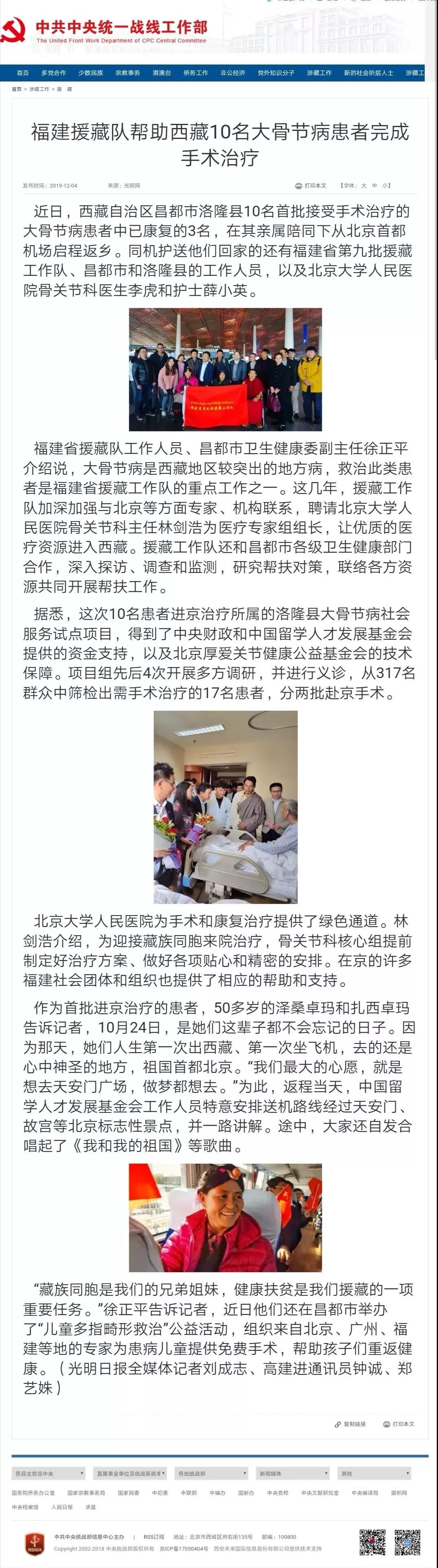中央统战部|网站转文报道《福建援藏队帮助西藏大骨节病患者完成手术治疗》