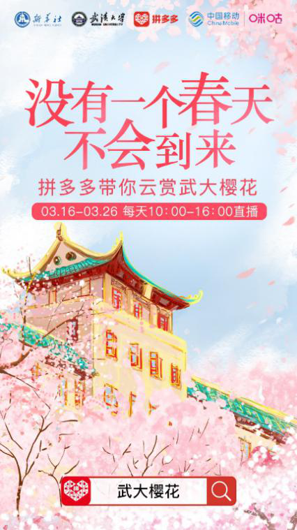 东南网3月17日讯(本网记者 陈楠)武汉的疫情尚未彻底结束,但樱花已经如期盛开。从3月16日起直到3月26日,拼多多将连续11天,通过多多直播的方式,联合武汉大学、新华社、咪咕等平台从每天早上10点到下午4点,为平台5.85亿用户开启在线“云赏樱”的窗口。 用户只需在拼多多APP里搜索“武大樱花”,就能直抵武汉大学樱花盛开的校园,欣赏春天里的绚烂美景。用户还能在相关专题页面,下单购买樱花酥等应景的武汉特产。