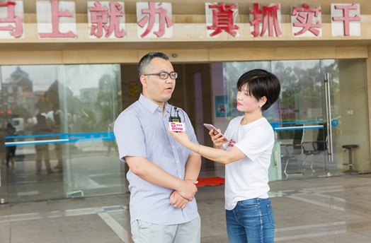 ▲5月8日,拼多多“百亿补贴”官方主播阿欢在中国(福建)自由贸易试验区门口,向直播间的观众问好。张冰 摄