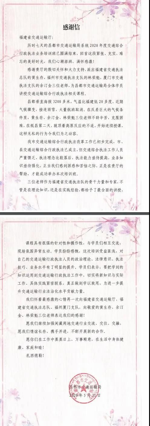 为进一步提高西藏昌都市交通运输系统行政执法人员的执法能力、执法效能,推动严格、规范、公正、文明执法,切实解决当前我市交通运输综合行政执法队伍存在的问题,引进交通行政执法先进经验、做法和措施,更好地促进昌都市交通运输事业的发展,经福建省第九批援藏工作队的沟通协调、在福建省交通运输厅的殷切关怀和大力支持下,并获得了西藏自治区交通运输厅的全力支持,昌都市交通运输局于5月23日至30日,在市局二楼会议室举办两期全市交通运输系统2020年度交通综合行政执法人员培训班,全局相关科室、市交通运输综合执法队、道路运输管理局和各县交通运输局干部职工共计151名学员参加了此次培训。 昌都市交通运输综合行政执法改革工作已初步完成,市、县两级执法队已相继成立,局党委立足当前执法工作实际,通过明察暗访、听取汇报、座谈了解等多种方式,深入市、县调研全市交通执法情况。目前,交通综合行政执法工作现状为:执法人员馈乏、执法理念落后,亟需强化理论业务知识,提高行政执法能力。 福建省第九批援藏工作队、昌都市交通运输局邀请了福建省交通执法总队陆路督察处处长黄生存、厦门市交通执法支队政策法规处处长余汀金、福州市交通执法支队副支队长林荣魁等三位专家来昌指导并授课。三位专家均在交通执法战线长期工作,在执法部门成立初期,不断探索实践,建章立制,积累经验,直至形成一套完整的执法理论和执法经验 黄生存处长以“以综合执法改革为契机,着力提升交通综合执法执行力”和“运用科技手段,推进路政执法行业治理能力现代化”为题,用生动的事例,结合日常执法深入浅出地讲解了《公路法》、《交通运输行政执法程序规定》等相关法规条例,全面介绍了新版执法文书和需要注意的问题,并联系实际,对执法过程中遇到的难题,提出针对性的措施和建议;余汀金处长以“综合类法律在交通执法中的运用”、“案例评析及交通执法安全监管”为题,从《行政处罚法》《行政强制法》入手,对行政执法人员依法从政、廉洁从政等方面进行解读,并从身边人、身边事入手,通过一个个生动的案例,结合法规条款,讲解了规范执法的重要性;林荣魁副支队长以“交通执法路面监管实战运用”为题,深入讲解了《行政复议法》的相关规定,就程序准确规范、实体法运用规范、证据收集规范、卷宗归档规范做出了重点要求,指出执法人员应加强当事人合法权益的保护,充分保障行政相对人的陈述、申辩、听证等权利。 三位培训老师紧紧围绕道路运输执法典型案例分析,证据收集和文书制作;全面推行“双随机一公开”与“三项制度”改革,努力提高行政执法水平,行政执法案卷中理论和实务等方面进行了系统授课,以详实、准确、朴实的语言和生动鲜活的案例分析,为参训学员讲授了交通运输行政执法中的常见问题和解决方法,充分阐述新时期严格、规范、公正、文明执法的新要求,有很强的针对性和现实操作性,要求提高自身素质,法治意识和廉政意识,始终要有程序意识、证据意识,确保依法行政,清正廉洁。切实提升了全市交通运输系统干部职工的法律意识和依法行政水平。 通过开展集中培训,大家既提高了业务素质,又受到了法治教育。学员纷纷表示,将把学到的知识运用到交通运输行政执法工作中,切实将新知识与实际工作、具体实践紧密联系,真正做到学以致用,为进一步提升交通运输行业法治化水平贡献力量。我局将进一步加强作风建设,严肃工作纪律,立足新的形势要求和基层执法实际,依法有效履行职责,提高行政执法效能。 一封来自西藏的感谢信