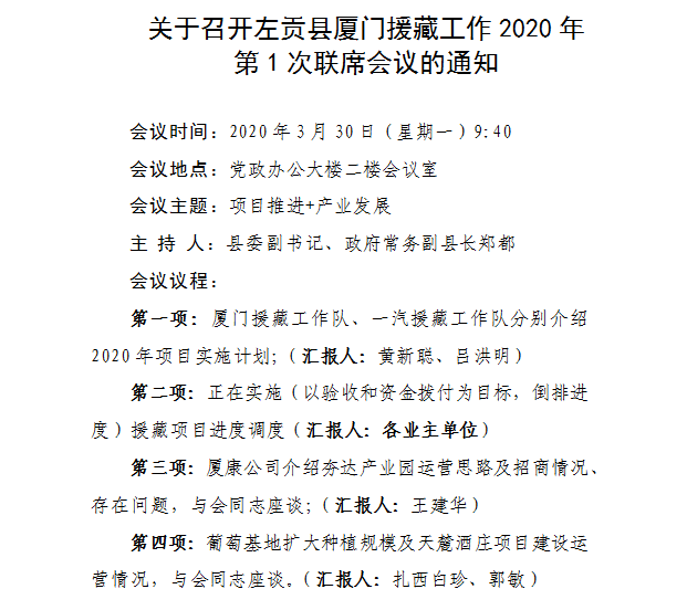 《左贡县援藏工作联席会议制度》建立于2019年底,由闽九援左贡工作组发起,每月由左贡县委县政府、闽九援左贡工作组、一汽援藏工作队、空军特色医疗中心援藏医疗队及各业主单位、县受援办等相关各方共同参与,旨在进一步畅通沟通渠道,形成思想、行动、工作上的合力,让各方力量更加协调有序地为左贡发展做出贡献,切实提高各方工作效率。经过去年底以来的实践,左贡县援藏工作联席会议制度切实解决了以往援藏项目及相关工作调度随意性大、工作重点目标难以迅速达成共识、项目推进滞后等问题,使得左贡县援藏各项目建设有条不紊地开展,援藏工作被迅速纳入左贡县委县政府工作总体部署,各方形成合力,推进项目和资金使用更加安全高效。 (供稿:闽九援左贡工作组) |
