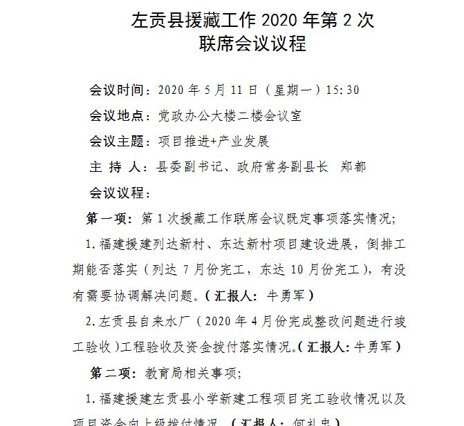 近日,左贡县委办印发《左贡县援藏项目信息资金流程规范》,这是左贡县为进一步规范援藏项目资金使用,提高项目效率的一个举措。此前,援藏项目信息和资金流程存在多头参与、信息沟通滞后以致援助单位信息无互通、项目推进情况不同步、资金到位及拨付情况不明确等问题,为此,福建省第九批援藏工作队左贡工作组牵头负责起草,全面优化流程,规范援藏项目相关信息、资金等业务流程管理及各环节办理时限。 2020年5月11日,左贡县召开左贡县2020年第2次援藏工作联席会议上,各相关业主单位就本年度第1次援藏工作联席会议既定事项落实情况及近期援藏项目进行了汇报;闽九援左贡工作组、中国一汽援藏队通报了近期援藏工作动态,与会人员共同讨论了十四五援藏规划重点内容以及如何进一步规范援藏项目资金使用流程等。