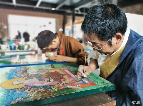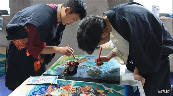 本次直播活动由福建省文化和旅游厅指导,福建省艺术馆(福建省非物质文化遗产保护中心)、昌都市文化局(市文物局)、福建省第九批援藏工作队主办,昌都市新区管委会协办,海峡教育报承办。 2019年,福建省第九批援藏工作队会同福建省文旅厅、福建省艺术馆和昌都市文化局联合组建了“唐卡漆画文化产业小组团”,选取昌都市唐卡艺术传承人和唐卡画师为重点培训对象,教授运用漆画技艺制作唐卡作品。今年5月,昌都市首届唐卡漆画技艺培训班在西藏昌都开班,37名学员经过40天培训,将创作一批以昌都解放70周年为主题的唐卡漆画作品,为昌都解放70周年献礼。 培训班既是福建艺术扶贫工程打造的农民漆画创新实践的升级版,也是福建省第九批援藏工作队按照中组部精准实施“小组团”援藏工作的要求,采取“短小精专”的组团方式,找准切入点,解决问题,填补行业空白创新的“福建经验”和“福建模式”
