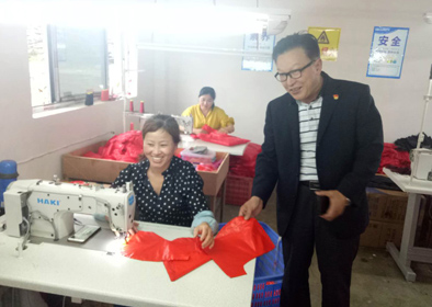 李然(右)看望在芙蓉制衣间工作的贫困户胡爱珍(新华社 熊鹏 5月7日摄)