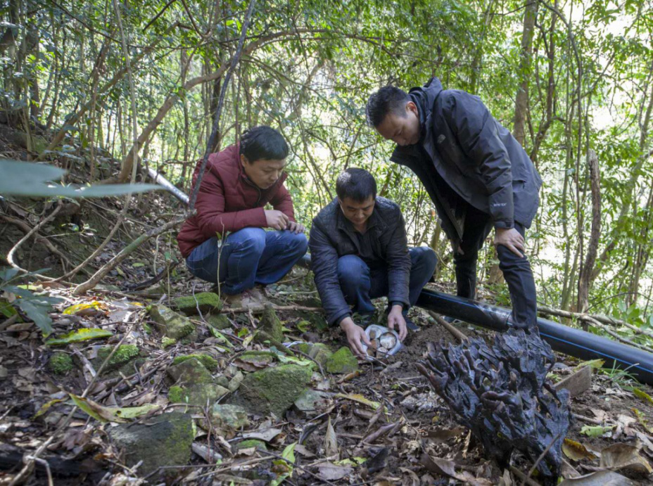 记者看到,种植户们在雨后的山林下挖坑深 30 厘米、宽 25 厘米左右的坑、把培养好的灵芝菌包脱去塑料膜、把菌包放入坑中、再覆上泥土,露出三厘米左右的菌包,然后把土压实、上面盖上一点树叶或茅草。