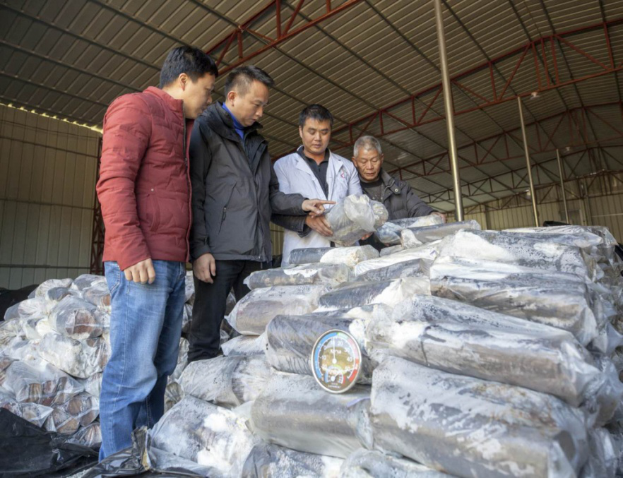 相关技术人员在检查灵芝菌苗发育情况。图片来源:海西晨报