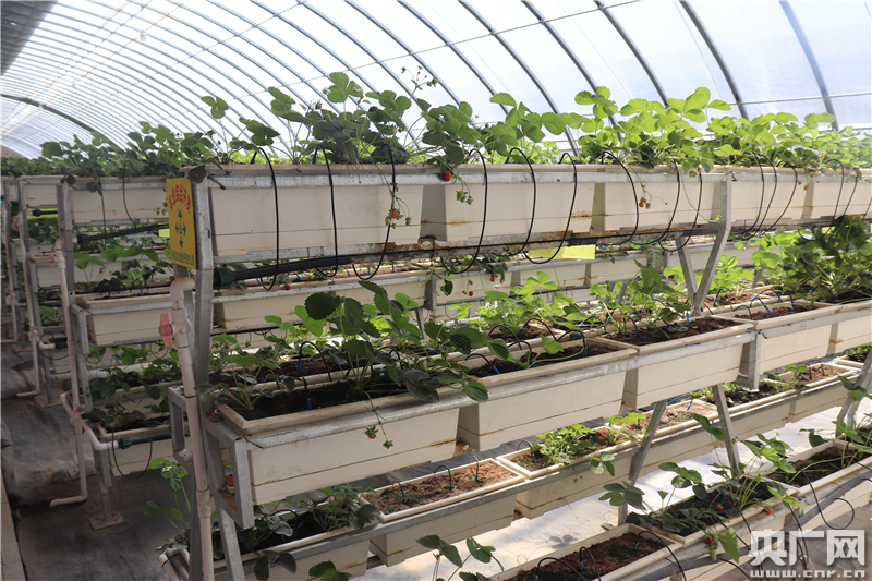目前,蔬菜基地的物联网设备能及时预测气象灾害、病虫害,有效降低灾害损失。此外,基地还可通过视频监控系统和移动终端APP,实现透明化生产管理。图为装有物联网设备的草莓日光温室。(央广网记者 母晨静 摄)