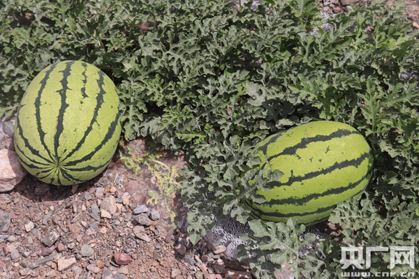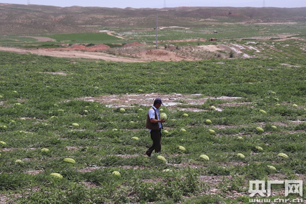 中卫市中宁县喊叫水村硒砂瓜田(央广网记者 母晨静 摄) 随后,记者又来到中卫市中宁县喊叫水村硒砂瓜田。中卫位于宁夏中西部,黄河前套之首,水土光热等农业资源禀赋独特。硒砂瓜又被称为“石头缝里长出的西瓜”,主要集中在中部干旱带环香山地区。